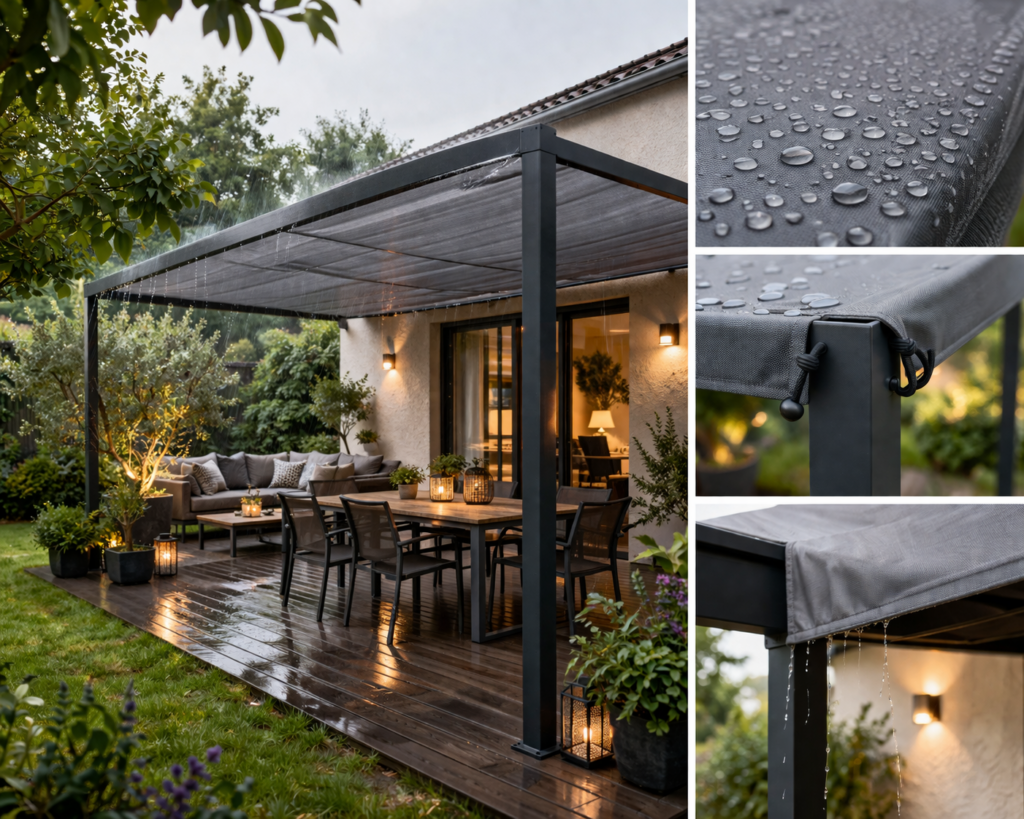 Oui, à condition de choisir un modèle imperméable en PVC ou polyester enduit avec une bonne tension d’installation. Ces matériaux assurent une excellente étanchéité face aux pluies classiques.